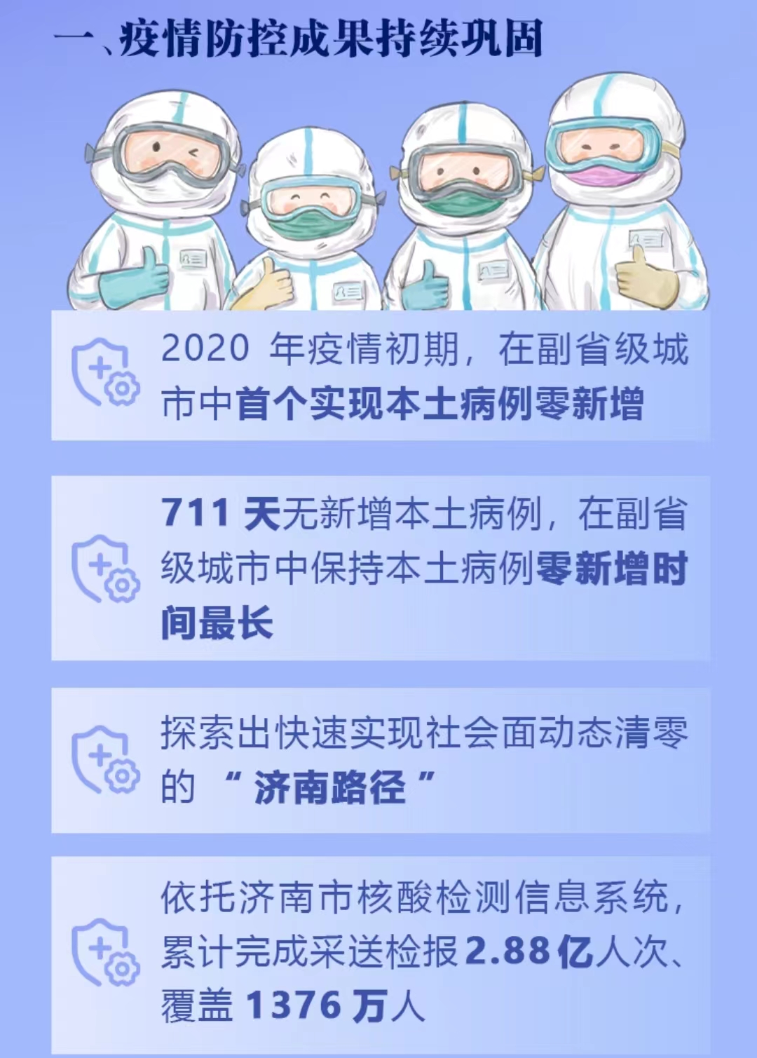 2020年疫情初期,仅用19天即成功阻断本土病例疫情,在副省级城市中首个实现本土病例零新增。2020年2月12日至2022年1月22日,保持711天无新增本土病例,在副省级城市中保持本土病例零新增时间最长。今年以来,在市委、市政府坚强领导下,“以快制快”有力处置3轮本土疫情,探索出在千万人口特大城市、省会城市,在不封城、不静止、不大规模管控的情况下,快速实现社会面动态清零的“济南路径”。特别是强化数字“抗疫”,依托济南市核酸检测信息系统,累计完成采送检报2.88亿人次、覆盖1376万人,发现社会面筛查病例44例。依托疫苗使用与预防接种管理全程追溯平台,新冠病毒疫苗100%一级直配、100%冷链运输、100%信息追溯,国务院联防联控机制予以充分肯定。