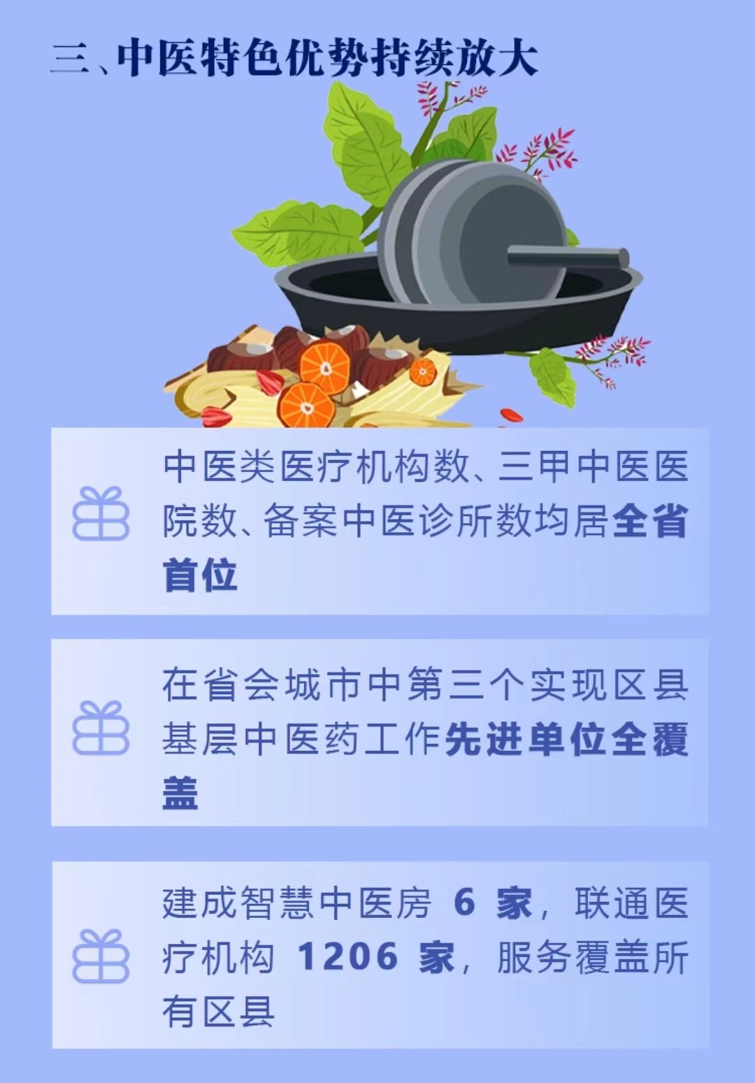 一是建强龙头。市中医医院创建为省级区域医疗中心。省、市政府与广安门医院签署协议,依托市中医医院,合作争创国家区域医疗中心。二是织密网络。我市中医类医疗机构数、三甲中医医院数、备案中医诊所数均居全省首位,社区卫生服务中心、镇卫生院全部设置国医堂。在省会城市中第三个实现区县基层中医药工作先进单位全覆盖。三是守正创新。试点智慧中医药服务,建成集远程会诊、处方流转、智能煎药、网上配送于一体的诊疗服务平台,出台智慧中药房地方行业标准、扶持政策,建成智慧中医房6家,联通医疗机构1206家,服务覆盖所有区县。成功承办第六届中医科学大会,世界中医药互联网产业大会永久会址落户我市。