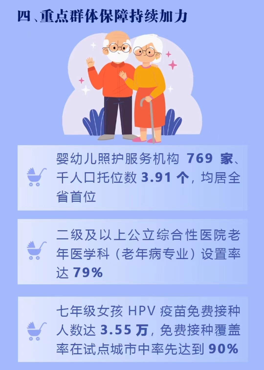 一是关爱“一小”,全市有婴幼儿照护服务机构769家、千人口托位数3.91个,均居全省首位。儿童贫血患病率降至4%,儿童眼保健和视力检查覆盖率达97.94%。成功承办国家人口战略和托育服务体系建设现场会并作典型发言。二是呵护“一老”,全市有医养结合示范区县10个、示范街镇107个、医养结合机构59家、国家示范性老年友好型社区4家。二级及以上公立综合性医院老年医学科(老年病专业)设置率达79%。三是聚力女性健康。作为全国首批、全省唯一试点市,七年级女孩HPV疫苗免费接种人数达3.55万,接种覆盖率在试点城市中率先达到90%。建成省、市、县三级危重孕产妇救治网络,“互联网+”高危妊娠管理入选全国妇幼健康典型案例。
