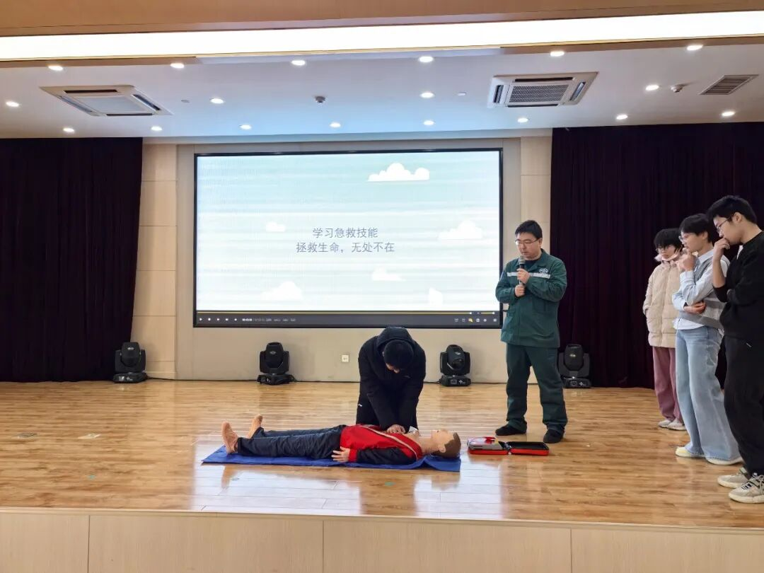 随后,急诊科的专业医师走上讲台,开启了一场系统而全面的知识讲解。医师一边详细阐述,一边逐步演示心肺复苏的全过程。从判断现场环境、检查意识到呼救求助,再到精准定位胸外按压点、掌握按压深度与频率,以及开放气道、实施人工呼吸的正确方法,每一个步骤都讲解得细致入微,每一个动作都演示得标准规范。与此同时,医师还现场操作自动体外除颤器(AED),清晰展示开机、贴放电极片、心律分析以及除颤等关键步骤,让同学们对这一“救命神器”的使用有了直观且清晰的认识。